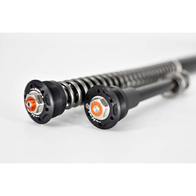 These cartridges fit right into the fork legs without modifications to the fork. The cartridges are closed, meaning that the cartridge is like a separate, pressurised shock absorber inside the fork with its own damping oil for optimal handling. The products were originally developed in close cooperation with adventure riders, world travelers and rally riders. The products have proven their value over the years: hugely improved off-road handling while retaining comfort during long travels. This is certainly also due to the huge size of piston used: 35 mm diameter. This size of piston is the largest of all aftermarket suspension providers. Apart from a high oil flow, this piston size allows for a stable, well-controlled damping behaviour. The size of the internal bore also allows to use electronic adjustments. Later on the cartridges have been further developed for use in road racing. Again the cartridge design has proven to be stable and finely adjustable. Every cartridge can be easily opened and serviced. Or the damping can be tuned for the customer's application. Spring rate, spring preload and air chamber are easily modified, there is for every product a range of springs available pending on loading and application. Every cover cap contains a dearation screw to remove an excess of foam and air.