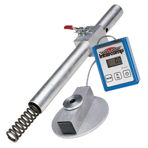 Intercomp Racings fork spring testers are designed to work with their digital coil spring testers. These testers accommodate up to 2 in./48mm diameter and 36 in./917mm long fork springs. They provide a readout in 0.1 lb./kg. increments. Intercomp fork spring testers include a load cell, a digital indicator, and a fork spring guide tube.