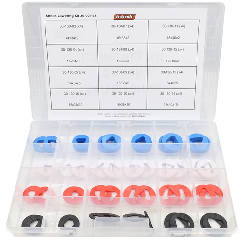 This kit contains four of every size of shock lowering spacer (IDxODxT) and is a perfect set for workshops who frequently do lowering work. Spacers are colour coded by thickness and made from durable nylon. Kit includes: